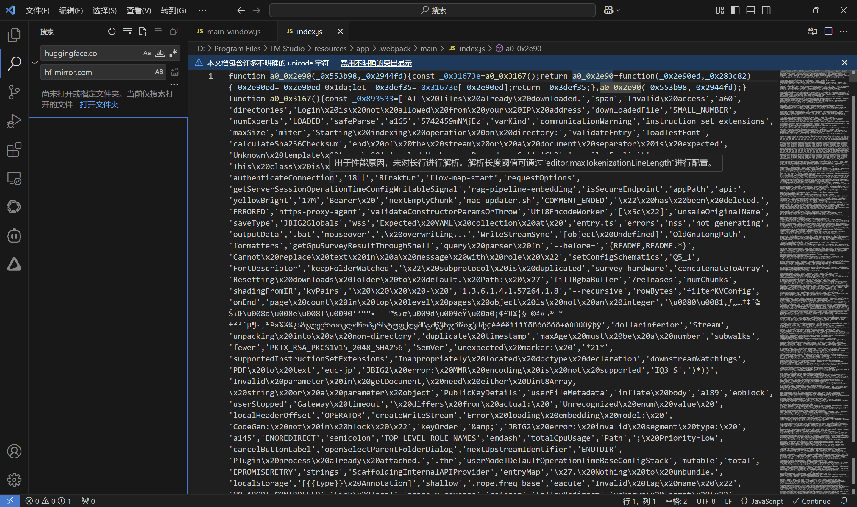 定位到LM Studio的安装目录,找到\LM Studio\resources\app\.webpack\main\index.js与\LM Studio\resources\app\.webpack\renderer\main_window.js文件,将文件内容中的huggingface.co替换为hf-mirror.com,解决国内访问不了huggingface.co,导致无法下载模型文件的问题。