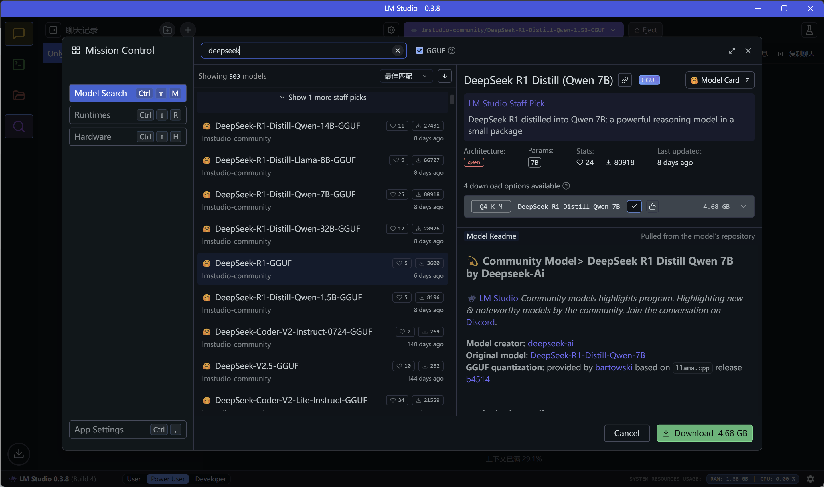 发现->搜索deepseek,建议安装DeepSeek-R1-Distill-Qwen-1.5B-GGUF(是基于 Qwen2.5-Math-1.5B 通过知识蒸馏得到的模型,该模型使用 DeepSeek-R1 生成的 80 万个精选样本进行微调),其它的版本对电脑性能要求较高。