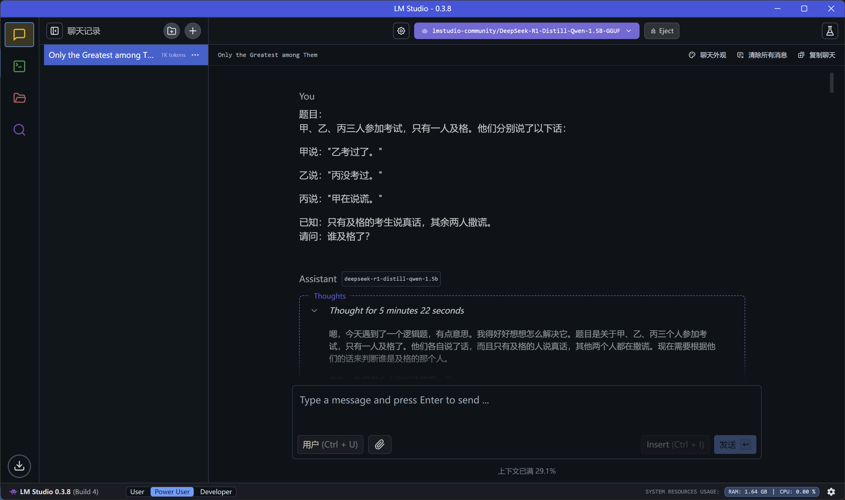 在聊天中加载下载的模型,就可以进行聊天,测试了一个逻辑题,思考时间大约是五分半钟。